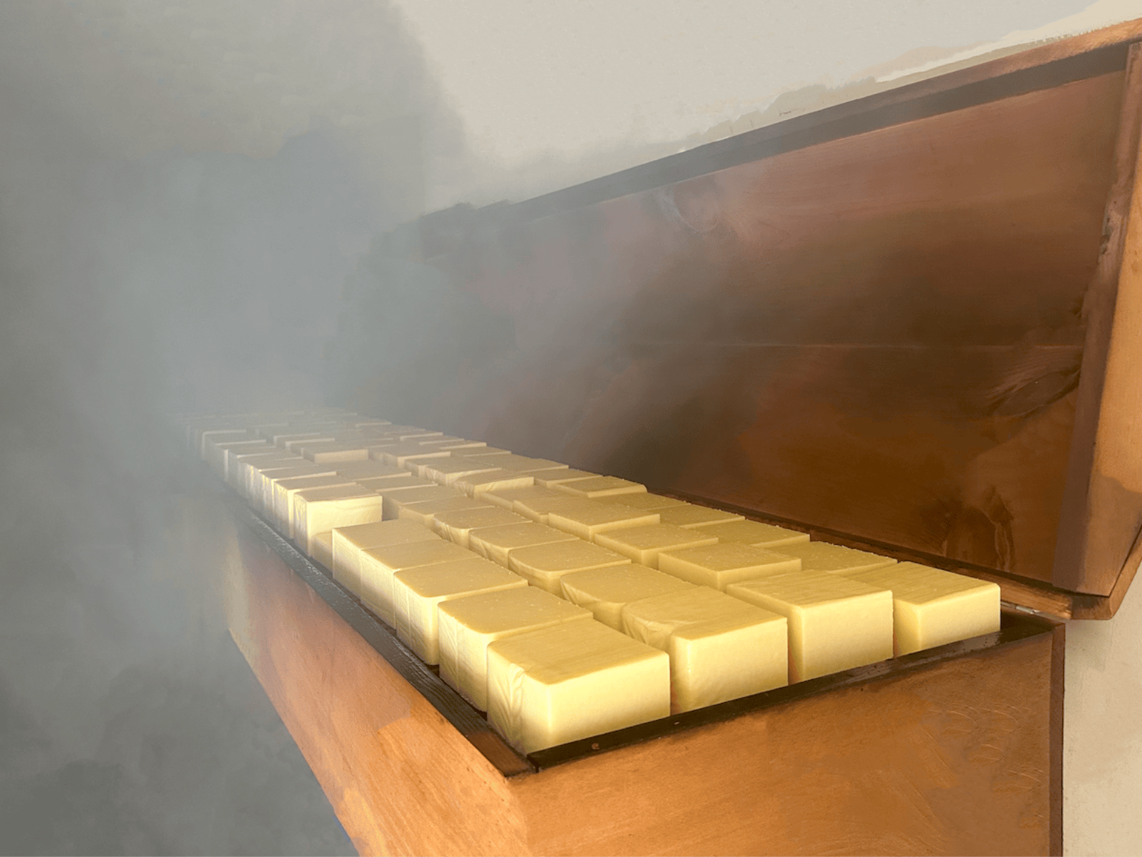 Cut the CurdNext, we cut the solidified curd into small cubes so that it can begin to release excess water called “whey.” Whey is the liquid that forms during the cheese fermentation process. It is made up of over 90% water, with the remaining percent a combination of lactose, vitamins, minerals, proteins and tiny amounts of fat.